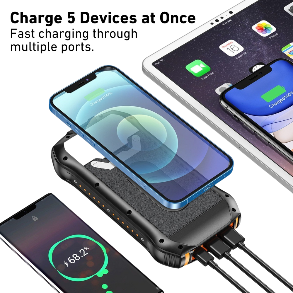 Fast wireless charging, USB-C input, or solar panel recharge for off-grid convenience.