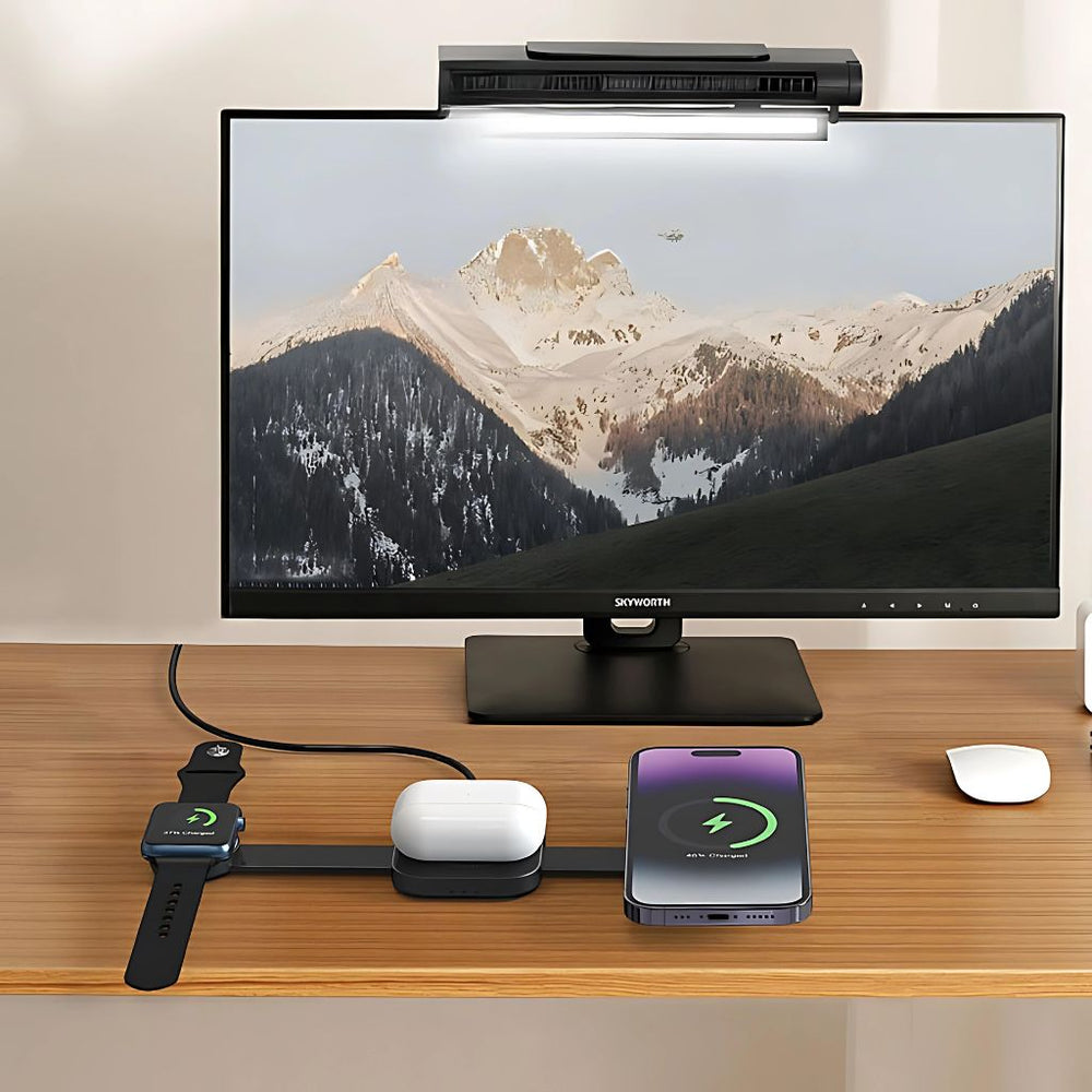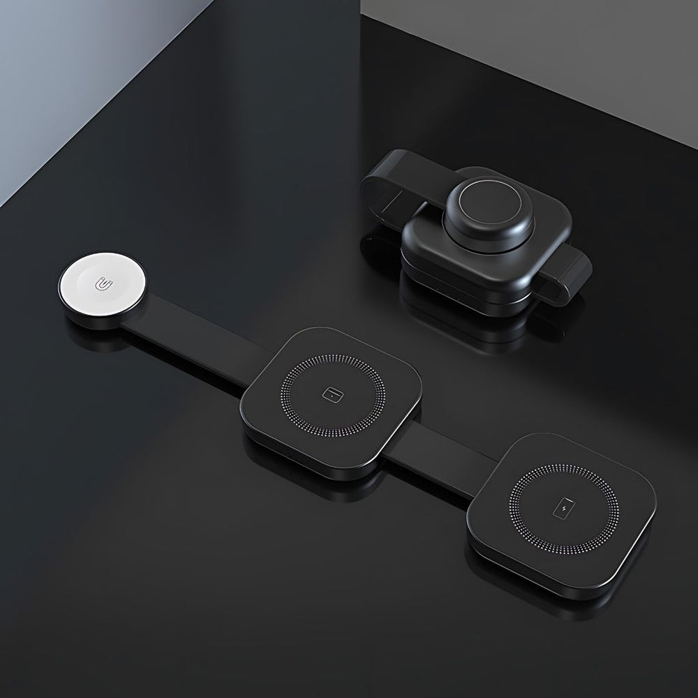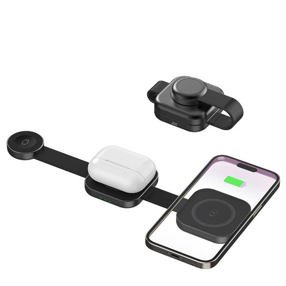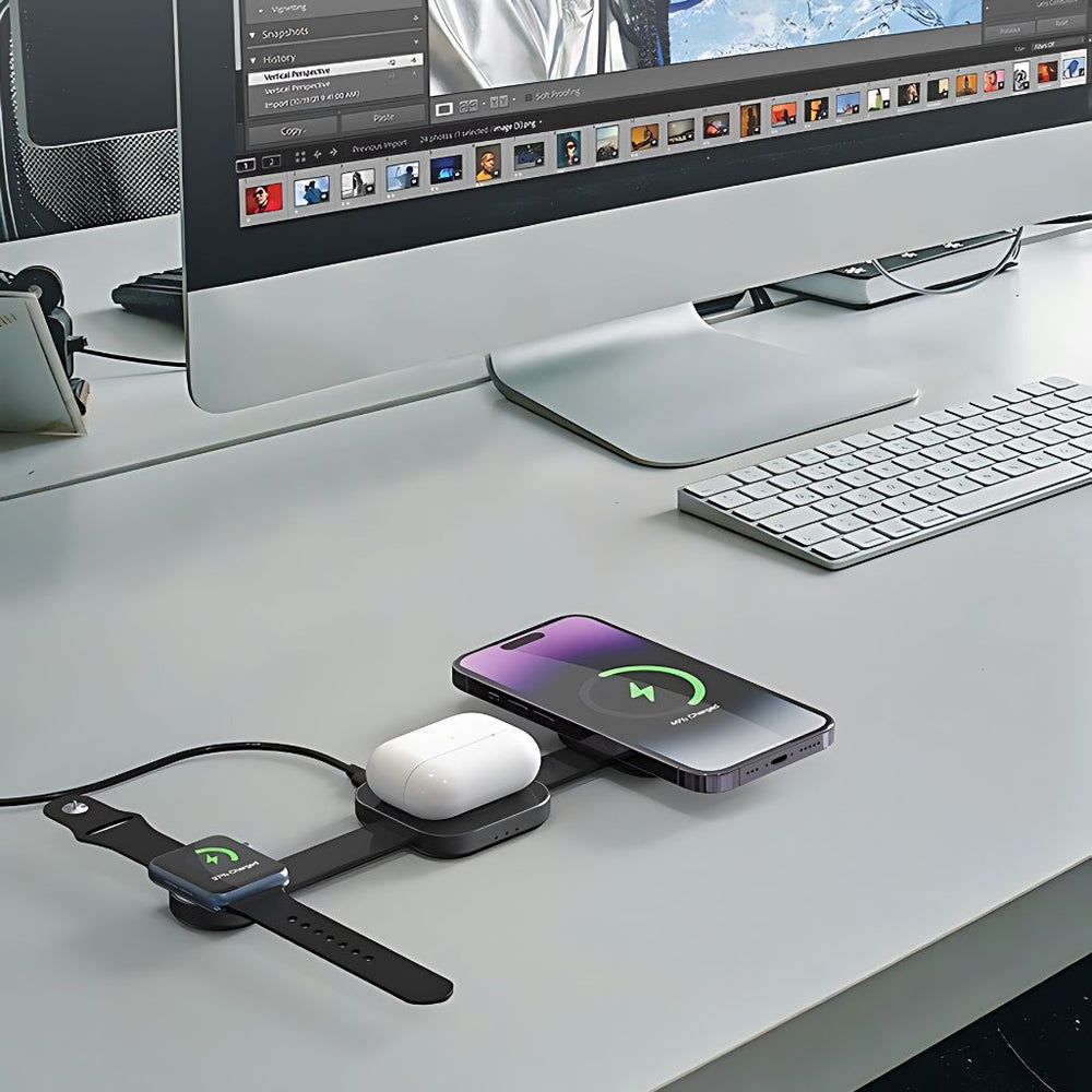 It works with MagSafe-compatible iPhones (12 series and newer), Apple Watch models—including Ultra—and AirPods with wireless charging like AirPods Pro.