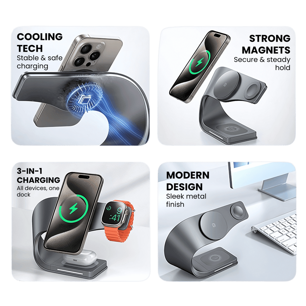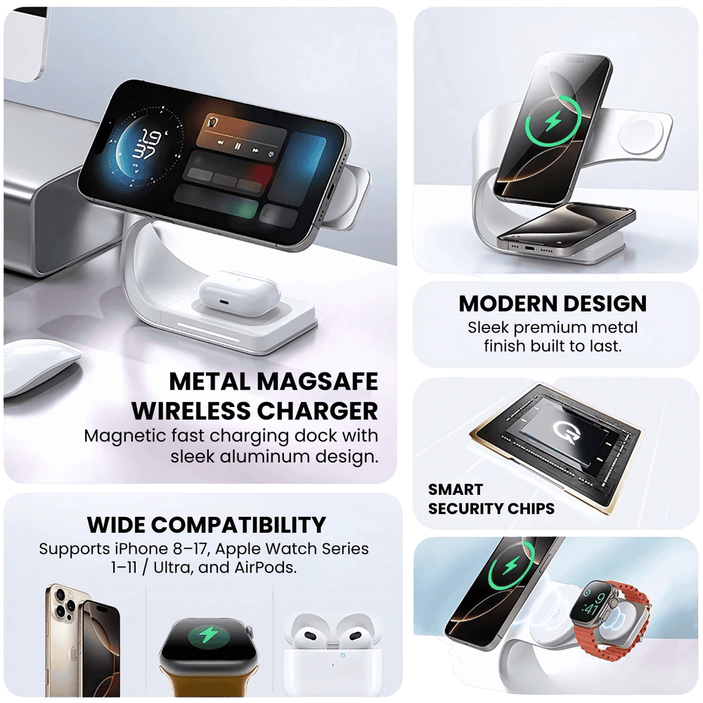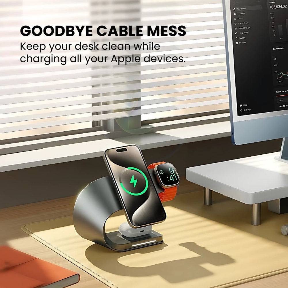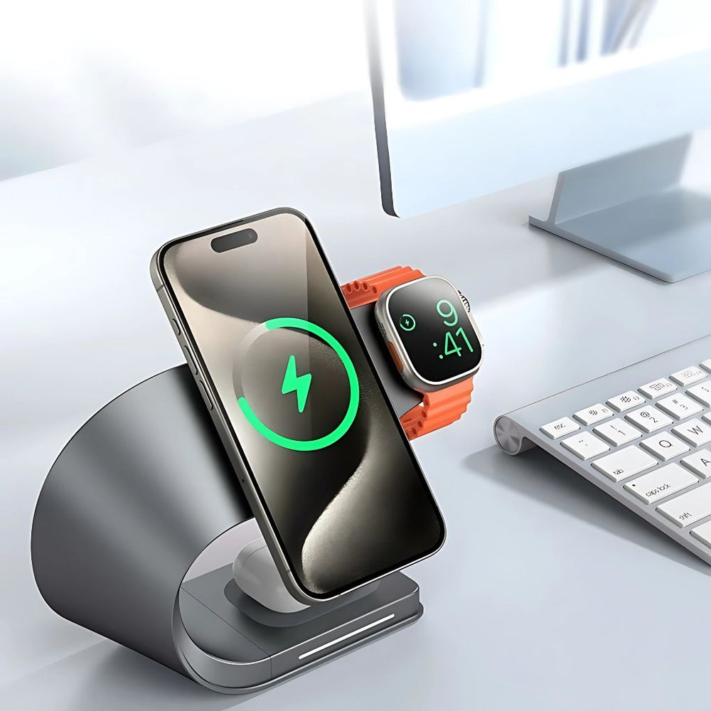 Charge iPhone, Apple Watch, and AirPods together — one sleek metal dock replaces multiple chargers.